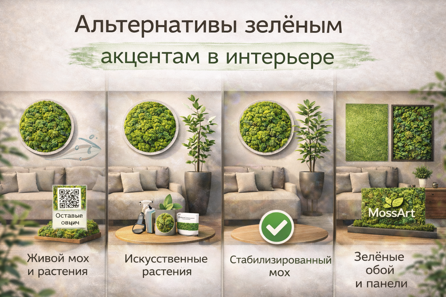 - Нужен зелёный фон без ухода → фотообои/постеры/искусственная зелень (только качественная)