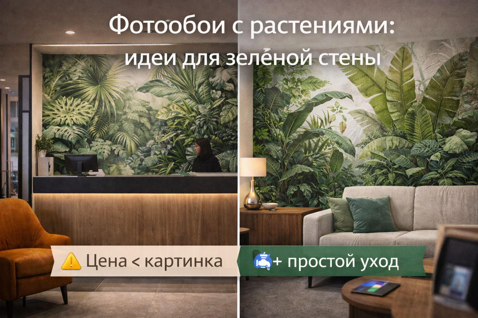 Фотообои с растениями - популярное решение, когда хочется “зелёную стену” быстро: без монтажа фитостены, без полива и без обслуживания. Они отлично работают как фон, создают настроение и могут визуально расширять пространство.
