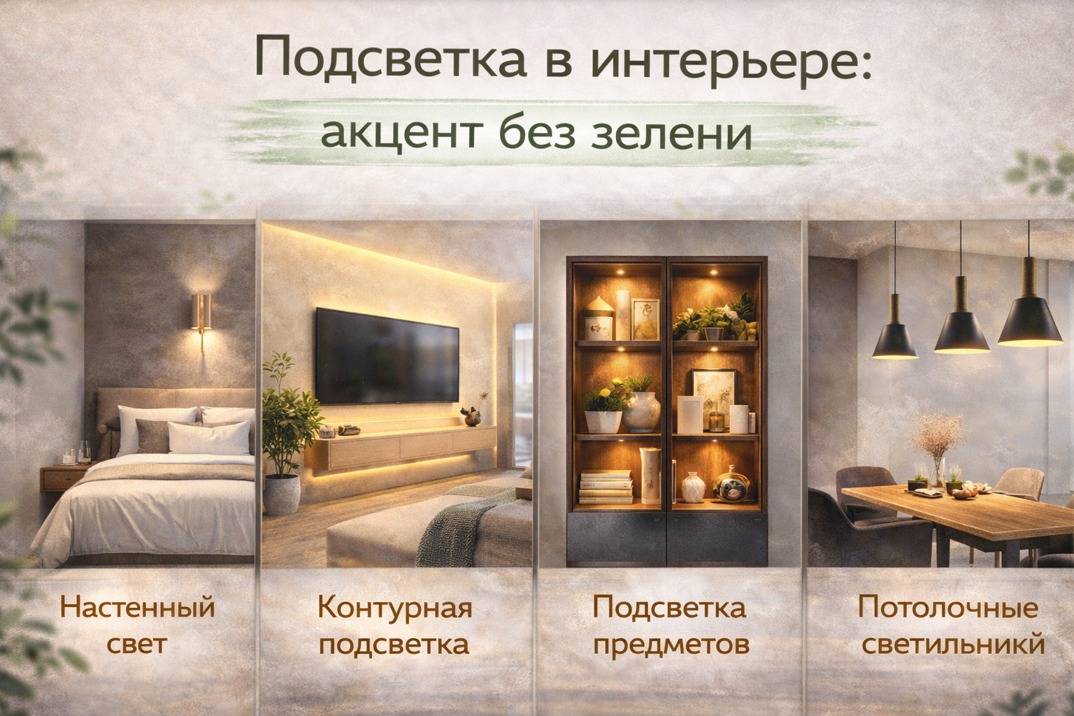 Днём многое “держит” естественный свет, а вечером интерьер может стать плоским. Акцентная подсветка делает картинку стабильной в любое время.
