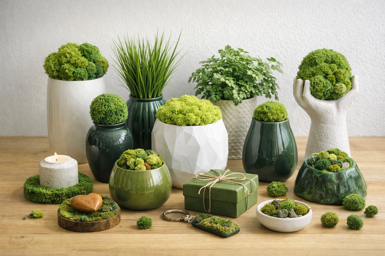 Стабилизированный мох даёт зелёный природный эффект без полива и без зависимости от света (при корректных условиях размещения). Он выглядит объёмно, “дорого” и отлично читается в кадре.