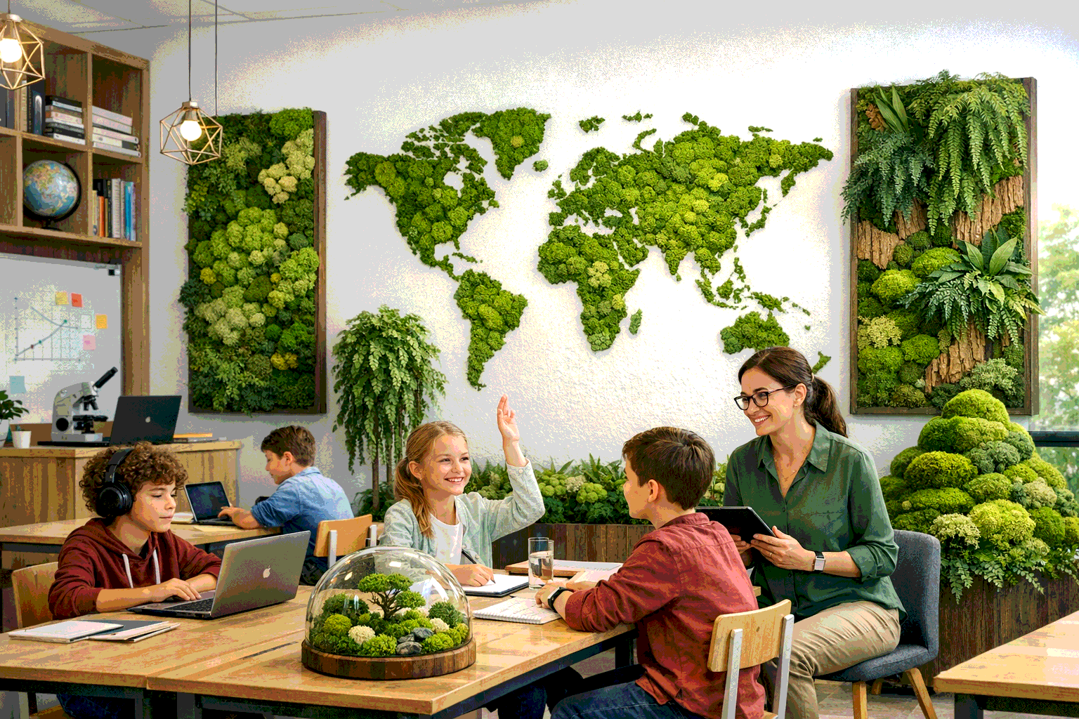 Мох добавляет уют и снижает “офисную холодность”, улучшая общий опыт студентов/учеников.