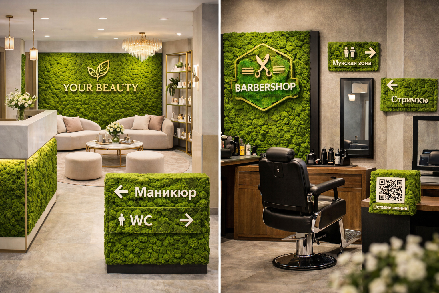 MossArt делает “зелёные” решения из стабилизированного мха для салонов красоты и барбершопов: логотипы, панели, бренд-стены, таблички и навигацию, фототочки и аккуратные акценты. Мох выглядит как кусочек природы, но не требует полива и сложного ухода. Вы заранее видите точный результат: мы создаём фотореалистичный эскиз из реальных материалов и реализуем на объекте совпадение 1 в 1.