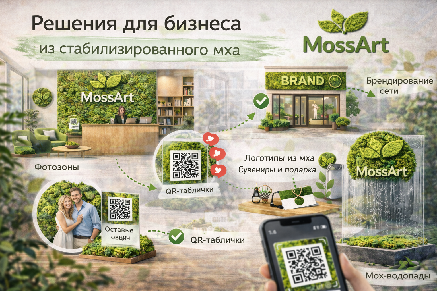 Мы относимся к мху не как к «декору ради декора», а как к инструменту: он усиливает первое впечатление, делает пространство дороже на вид, собирает фото и сторис, помогает бренду быть заметным - и при этом остаётся стабильным и аккуратным годами.