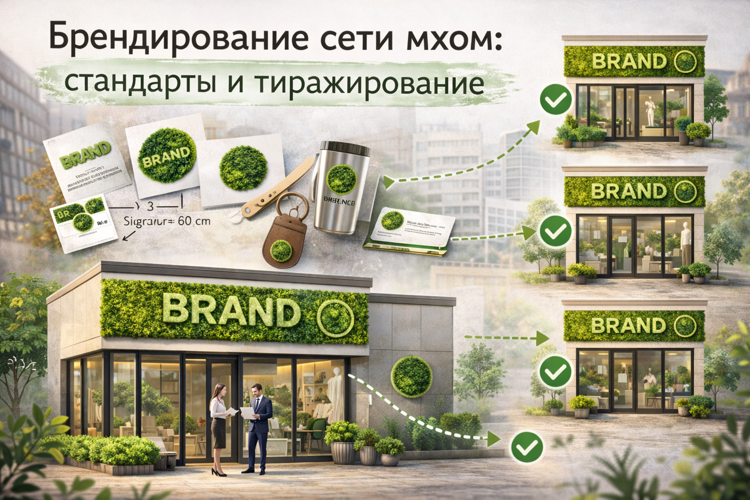Логотип/бренд-стена из мха считываются мгновенно и становятся «визитной карточкой» точки.
