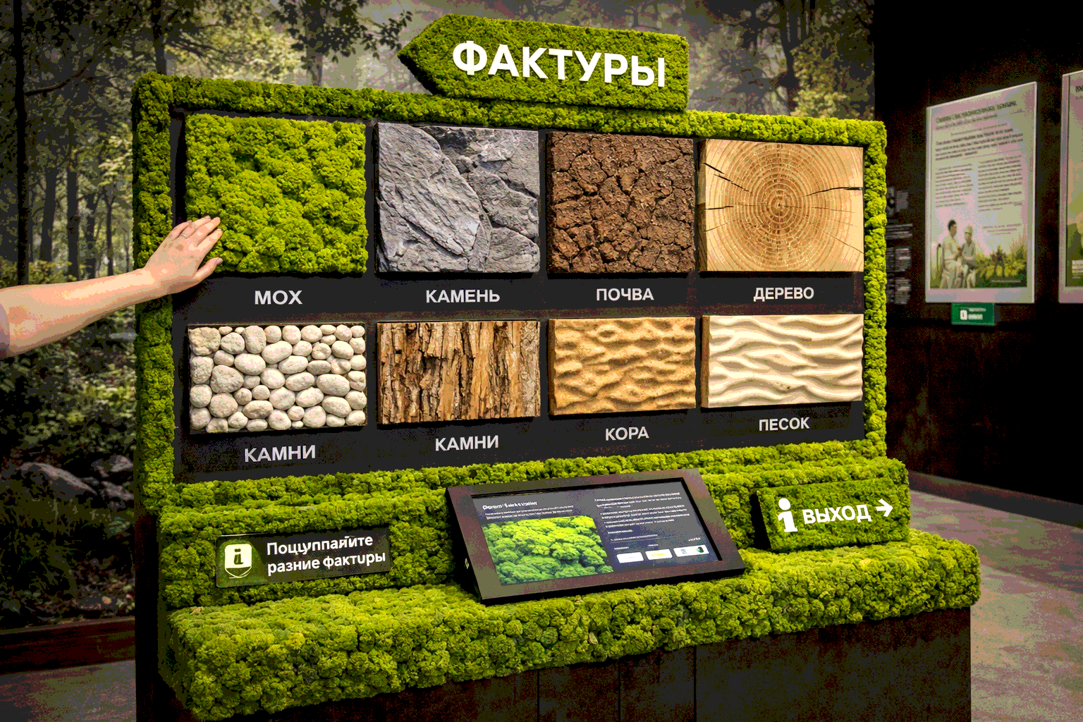 Расскажите тему экспозиции и пришлите фото площадки - мы предложим формат интерактивного стенда фактур с мхом, подготовим эскиз и рассчитаем проект.