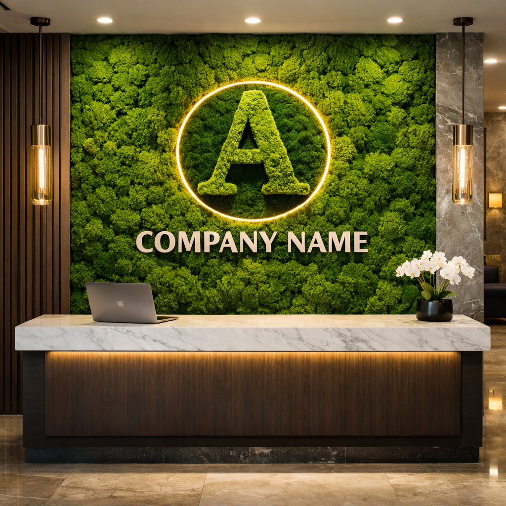 MossArt делает премиальные решения из стабилизированного мха для зоны ресепшена: бренд-стены, логотипы, панели, вставки и навигацию. Это выглядит как кусочек природы, но при этом не требует полива и сложного ухода. А главное - вы заранее видите точный результат: мы создаём фотореалистичный эскиз из реальных материалов и реализуем на объекте совпадение 1 в 1.