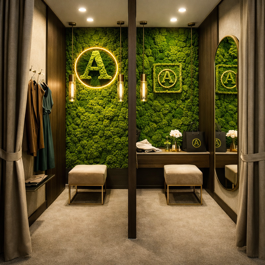 Логотип из мха или фирменный знак в зоне примерочной/ожидания - чтобы интерьер усиливал узнаваемость.