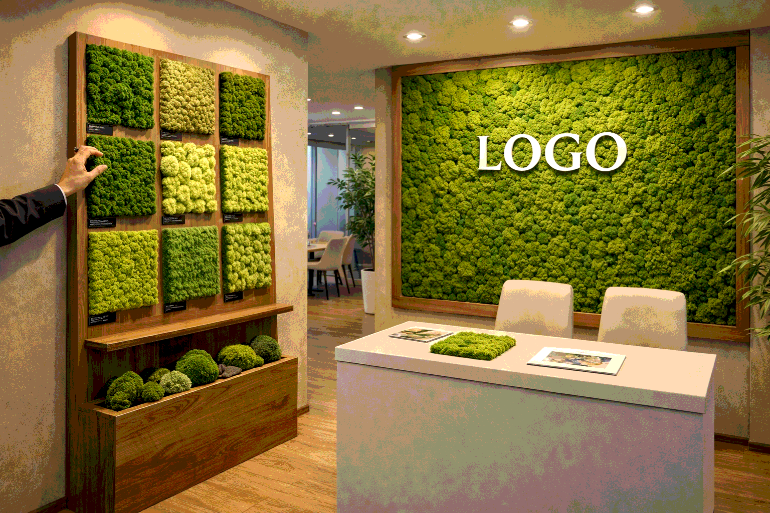 MossArt делает решения из стабилизированного мха для шоурумов, офисов продаж и демонстрационных зон: тактильные панели-образцы, стенды с палитрами, бренд-стены и акценты, которые помогают закрывать страхи и ускорять выбор. Вы заранее видите точный результат - мы создаём фотореалистичный эскиз из реальных материалов и реализуем совпадение 1 в 1.
