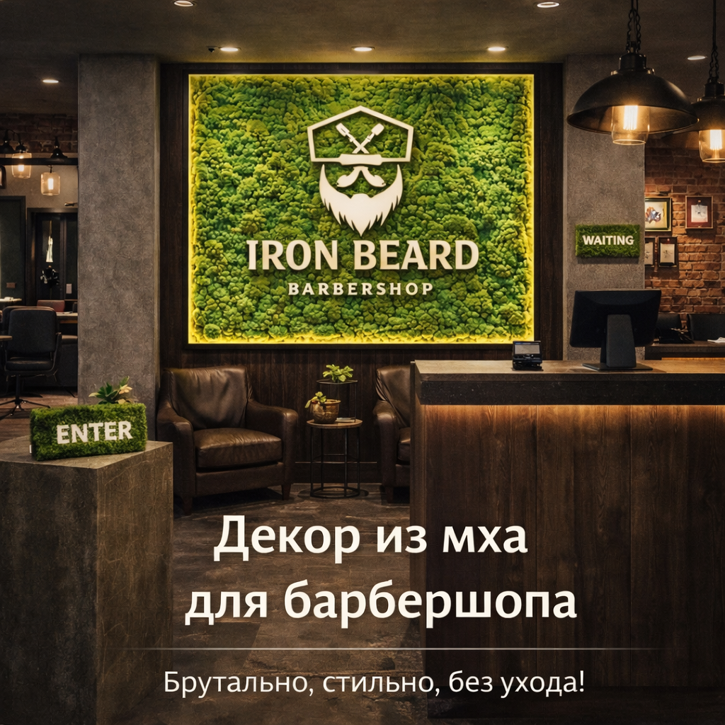 Барбершоп выбирают не только по мастерам, но и по атмосфере: брутальный интерьер, детали, “мужской” вайб, где хочется сделать фото и вернуться. Стабилизированный мох - сильный материал для барбершопа: он добавляет природный контраст дереву, кирпичу и металлу, выглядит дорого, даёт фактуру и “живую” глубину, при этом не требует полива и сложного ухода.