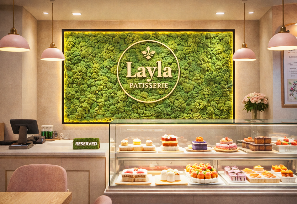 Кондитерская - это место, где всё должно выглядеть вкусно ещё до первого укуса. Люди выбирают глазами: витрина, упаковка, свет, фон - и часто фотографируют десерты и подарочные наборы. Поэтому интерьер здесь работает как часть продукта. Стабилизированный мох помогает создать “уют леса” и ощущение премиума, делает точку фотогеничной и запоминающейся, при этом не требует полива и сложного ухода - удобно для HoReCa и retail-формата.