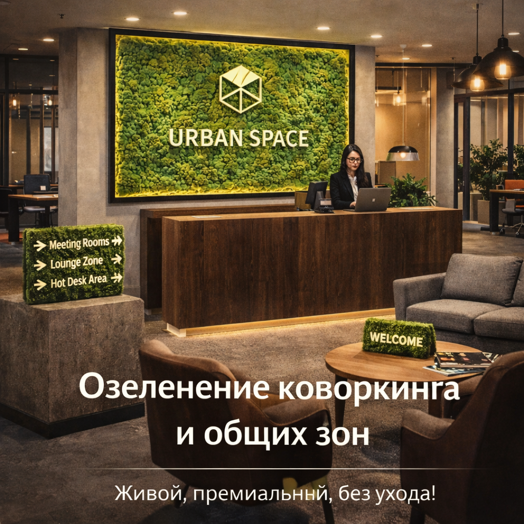 Коворкинг выбирают не только по столам и тарифам. Решают детали: первое впечатление на ресепшене, уют лаунжа, “дорогой” вид переговорных, понятная навигация, фотогеничные общие зоны. Стабилизированный мох помогает быстро усилить пространство: он выглядит как натуральная зелень, добавляет фактуру и спокойствие, при этом не требует полива и сложного ухода - идеально для мест с постоянным трафиком и клинингом.