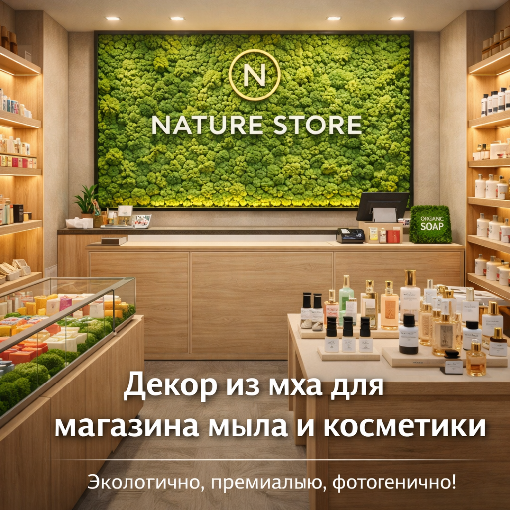Ниже - рабочие сценарии для магазина мыла и косметики: где разместить мох, какие форматы выбрать и как сделать так, чтобы интерьер продавал.