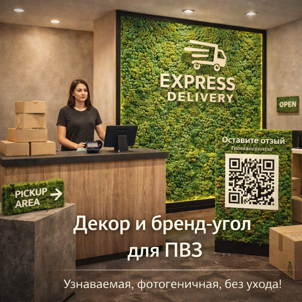 Пункт выдачи - это постоянный поток людей и короткий контакт. Но даже в таком формате интерьер влияет на всё: доверие, ощущение сервиса, аккуратность и готовность оставить отзыв. Большинство ПВЗ выглядят одинаково - и поэтому не запоминаются. Стабилизированный мох помогает быстро выделиться: он выглядит как натуральная зелень, добавляет “дорогую” фактуру, делает точку более дружелюбной и фотогеничной, при этом не требует полива и сложного ухода - идеально для небольших помещений с активным трафиком.
