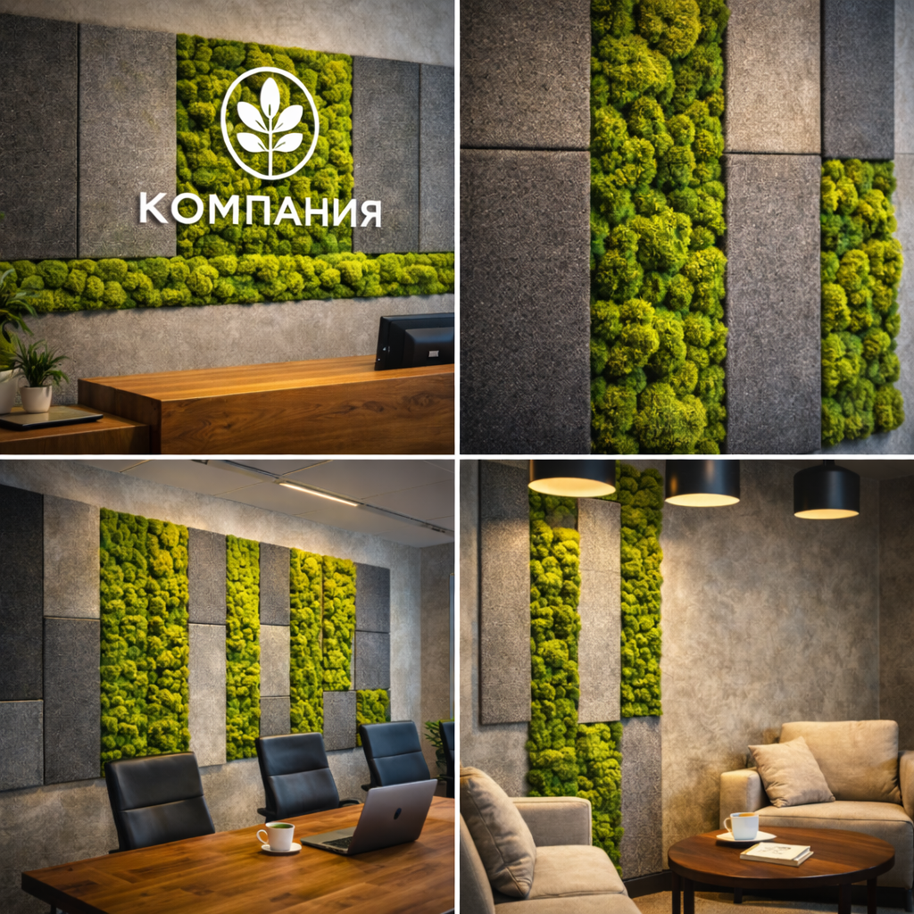 Акустические панели + крупная моховая вставка/панель как акцент.