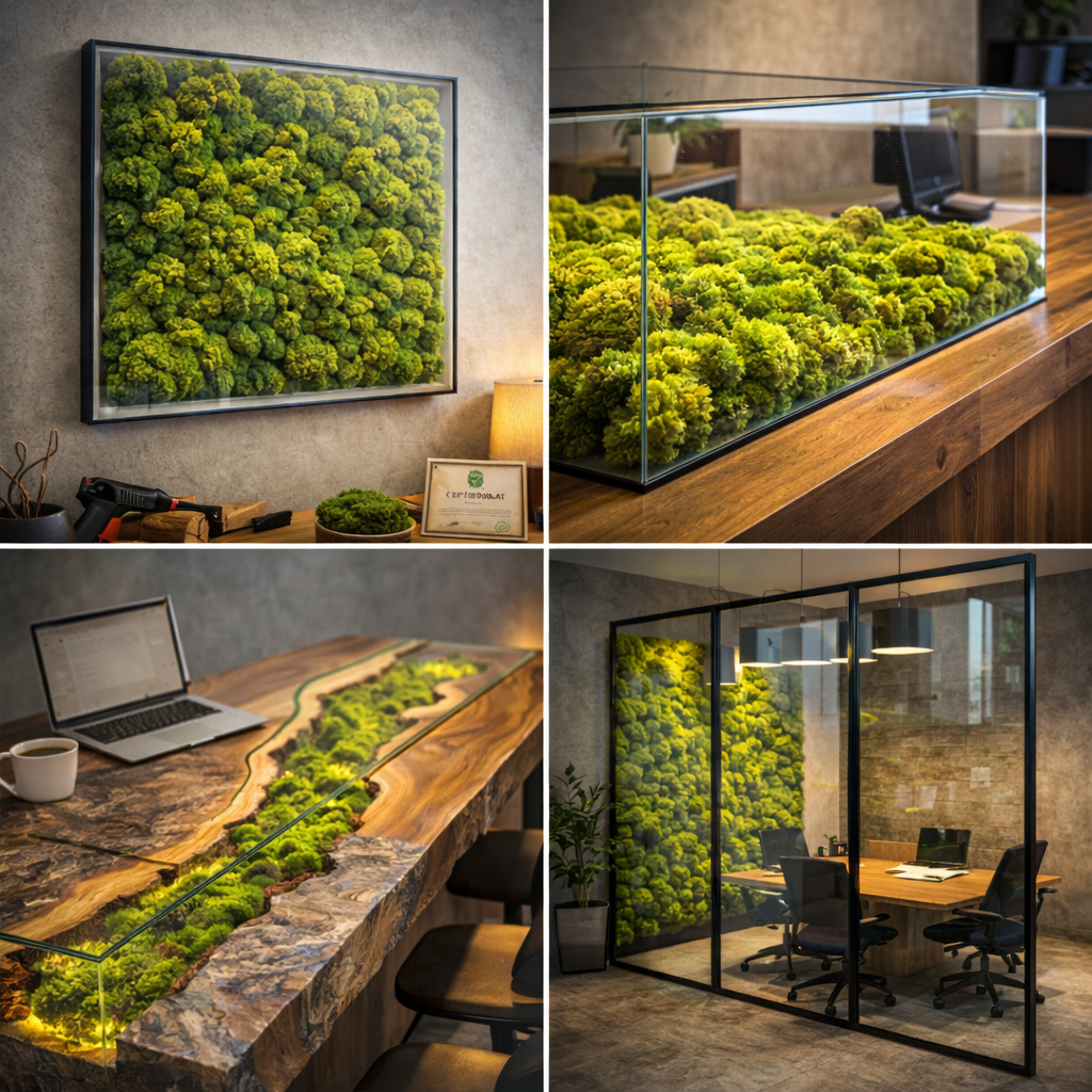 Выбирайте мох под стеклом: клиники, проходные зоны, мебельные вставки.