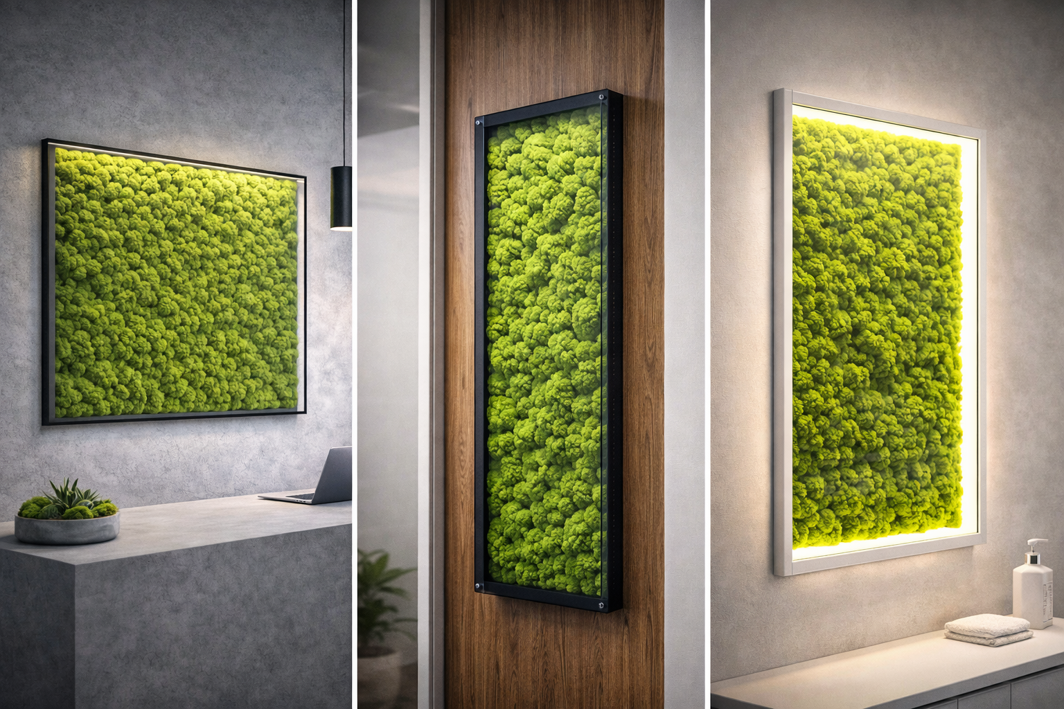 Мох под стеклом не требует полива и не зависит от света (при корректных условиях размещения), но даёт дополнительный плюс - защиту поверхности. Ниже - понятный гид по форматам: панно, вставки, лайтбоксы, а также где каждый вариант работает лучше.