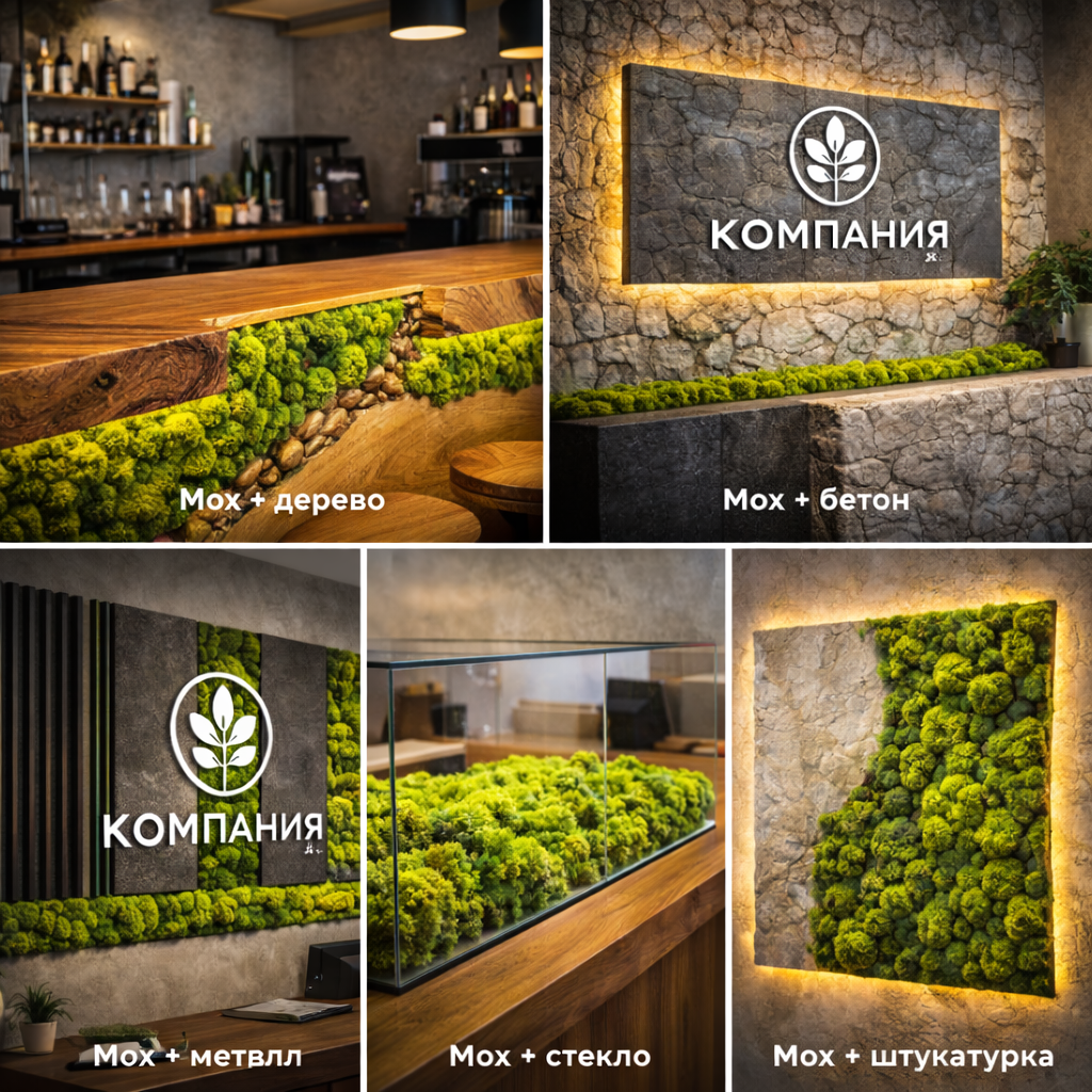 На этой странице - понятная карта сочетаний: какие материалы лучше всего дружат с мхом, где это особенно уместно (дом/бизнес) и каких ошибок стоит избегать.