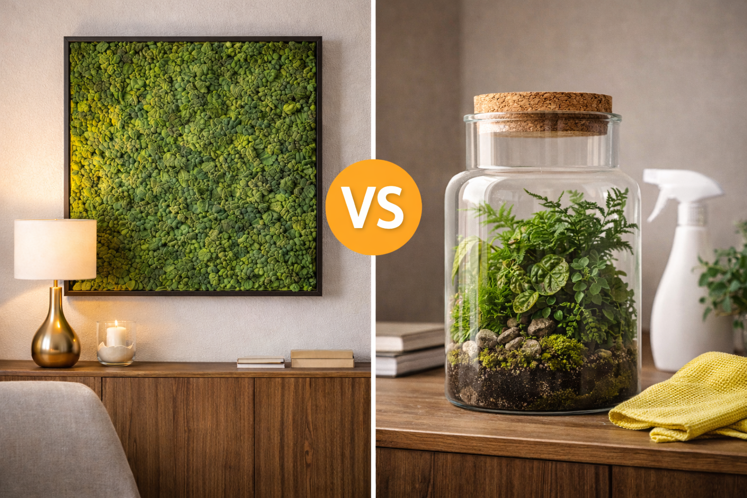 Флорариумы и стабилизированный мох часто выбирают по одной причине: хочется природный акцент без сложного ухода. На фото оба варианта выглядят “как маленький лес”, но в реальности это разные сценарии: флорариум - живой мини-биом с правилами, мох - стабильная природная фактура без полива.
