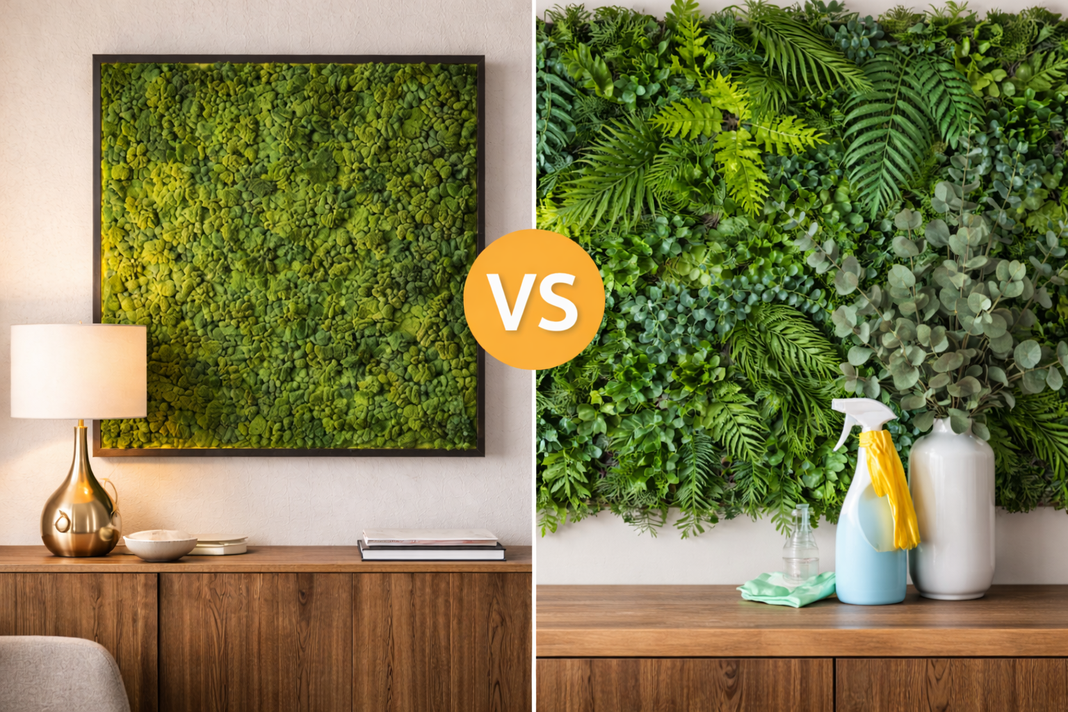 Если важна премиальность и “натуральное ощущение” - чаще выигрывает мох. Если нужен быстрый зелёный фон “издалека” - может подойти искусственная зелень.