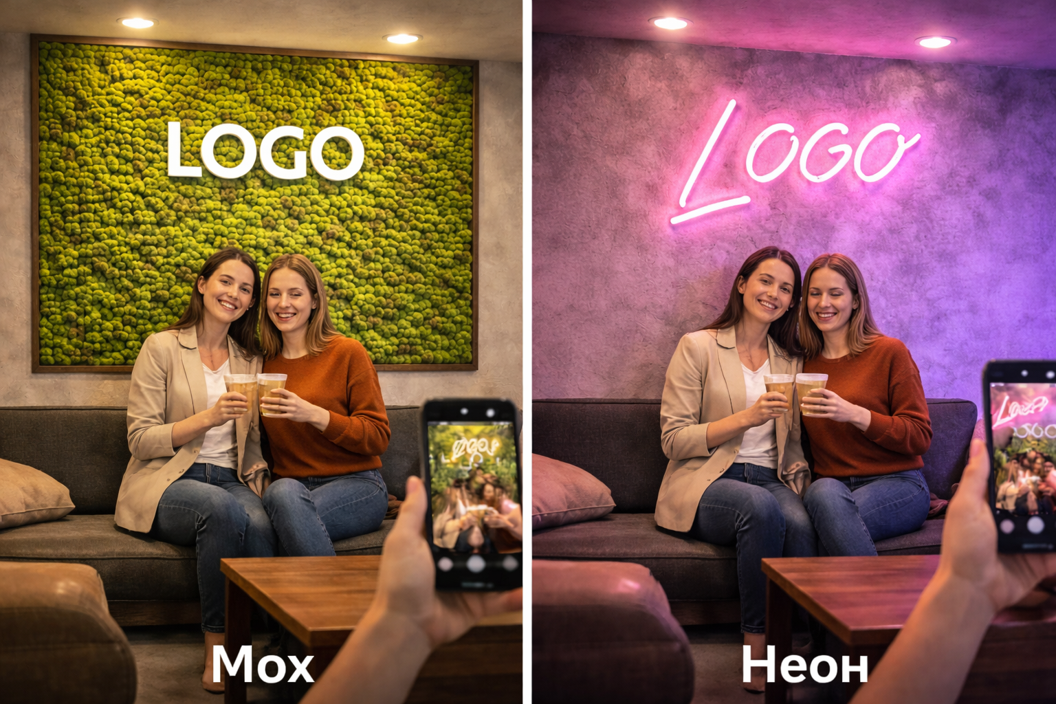 Мы предложим вариант: мох, неон/подсветка или комбинация - и подберём формат (логотип, панно, фотозона, контурная подсветка).