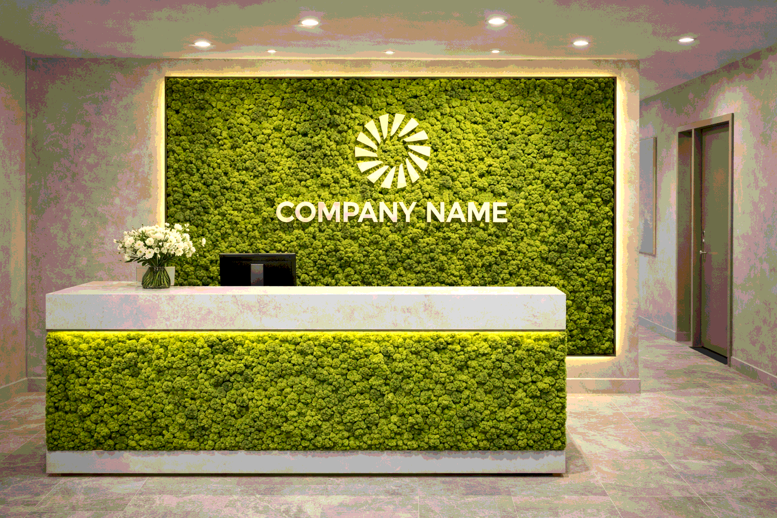 Ресепшен - это место, где за секунды формируется доверие: у клиента, партнёра, кандидата на работу. Если входная зона выглядит “дорого” и продуманно, бизнес воспринимается сильнее - даже до разговора с администратором. Стабилизированный мох отлично работает именно здесь: он даёт эффект природы и тактильности без полива и сложного ухода, а главное - выглядит как настоящий материал, который хочется рассмотреть и потрогать.