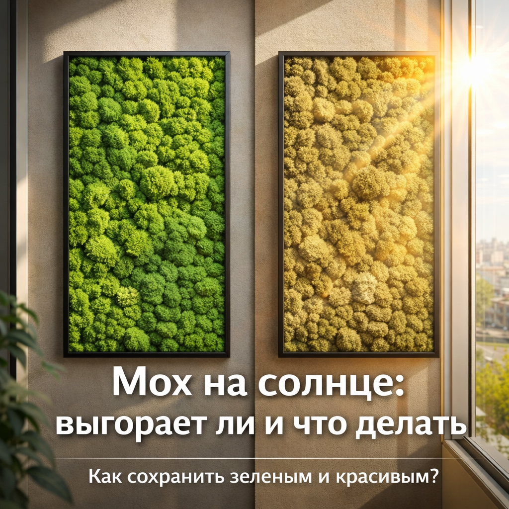 Когда выбирают мох для интерьера, хочется поставить его “в самое красивое место” - часто это светлая стена у окна, куда попадает солнце. Но у стабилизированного мха есть важное правило: прямые солнечные лучи нежелательны. Дело не только в выцветании - солнце может пересушивать материал и со временем ухудшать фактуру.