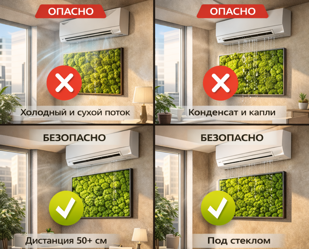 Короткий ответ: под кондиционером мох размещать можно не всегда. Если поток воздуха дует прямо на панно или есть риск капель - лучше выбрать другое место или формат. Ниже - понятная инструкция.