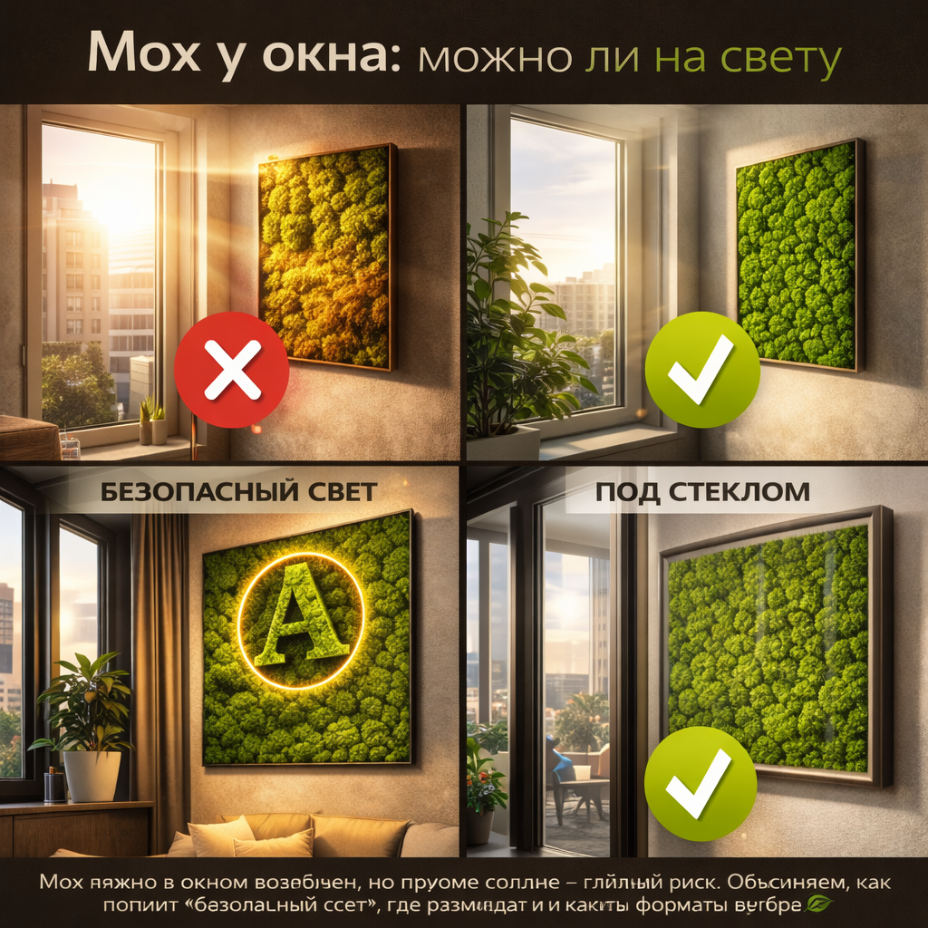 Окно - это свет, вид, воздух и иногда… прямые солнечные лучи, которые “жарят” стену несколько часов в день. И если для живых растений это часто плюс, то для стабилизированного мха прямое солнце - один из главных факторов риска: материал может пересушиваться и быстрее терять внешний вид.