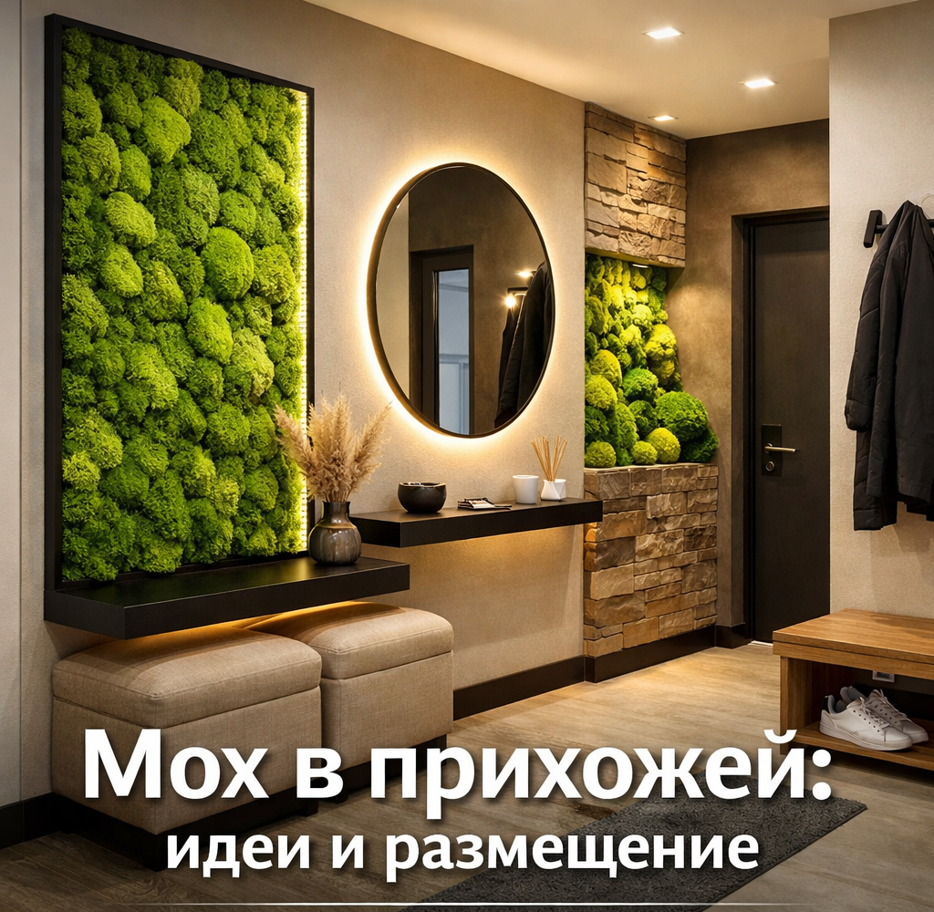 Прихожая - это первое впечатление о доме, квартире или офисе. Здесь хочется “вау”, но без сложных решений, которые требуют ухода и быстро пачкаются. Стабилизированный мох идеально подходит для входной зоны: выглядит как кусочек природы, добавляет мягкую фактуру и делает пространство дороже в ощущении - при этом без полива и обслуживания.