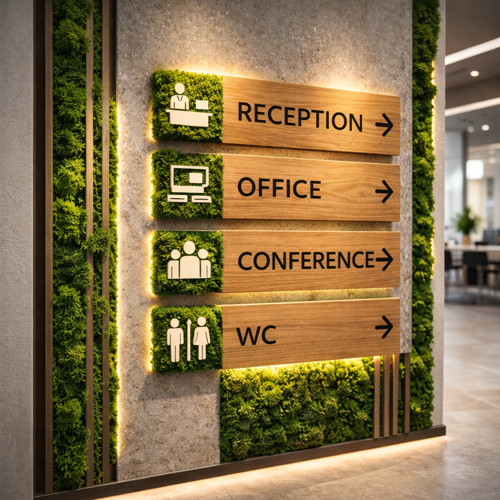 MossArt делает таблички и интерьерную навигацию с мхом из дерева - так, чтобы они были функциональными, но выглядели как часть дизайна. Мох добавляет объём и живую фактуру, дерево - тепло и статус, а аккуратная типографика делает информацию читаемой и спокойной.