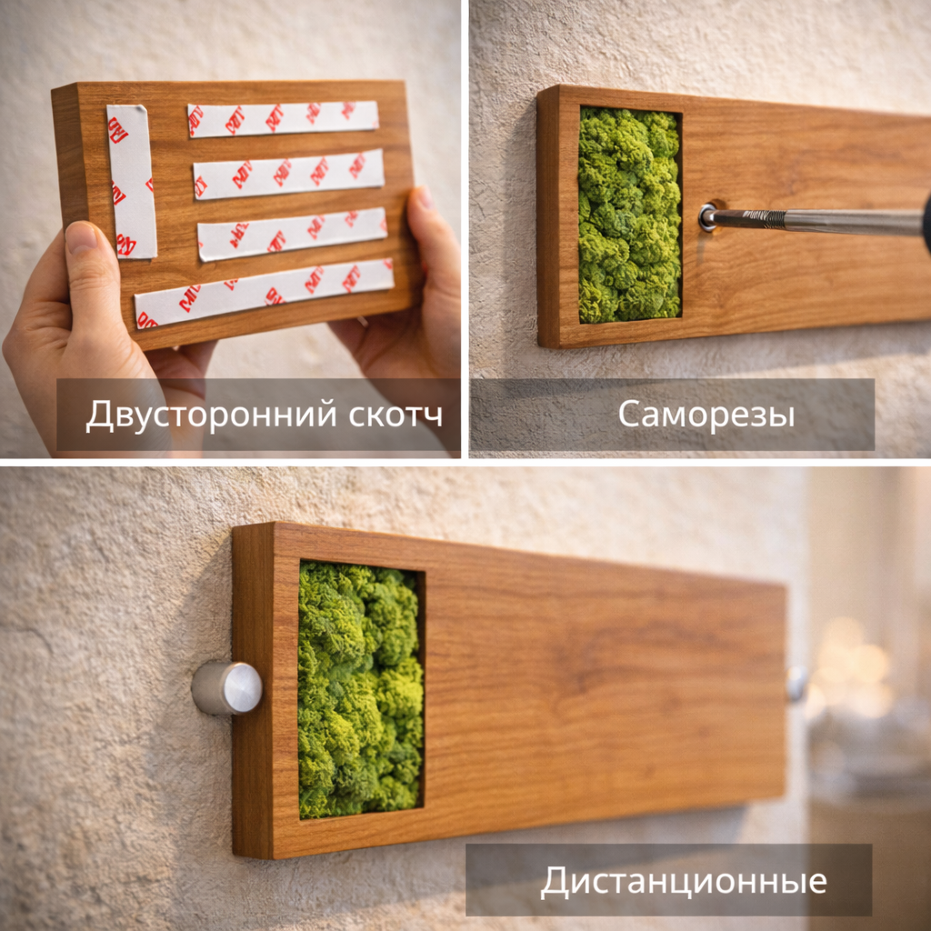 Стабилизированный мох не требует обслуживания, а правильно подобранное крепление сохраняет аккуратный вид на годы.