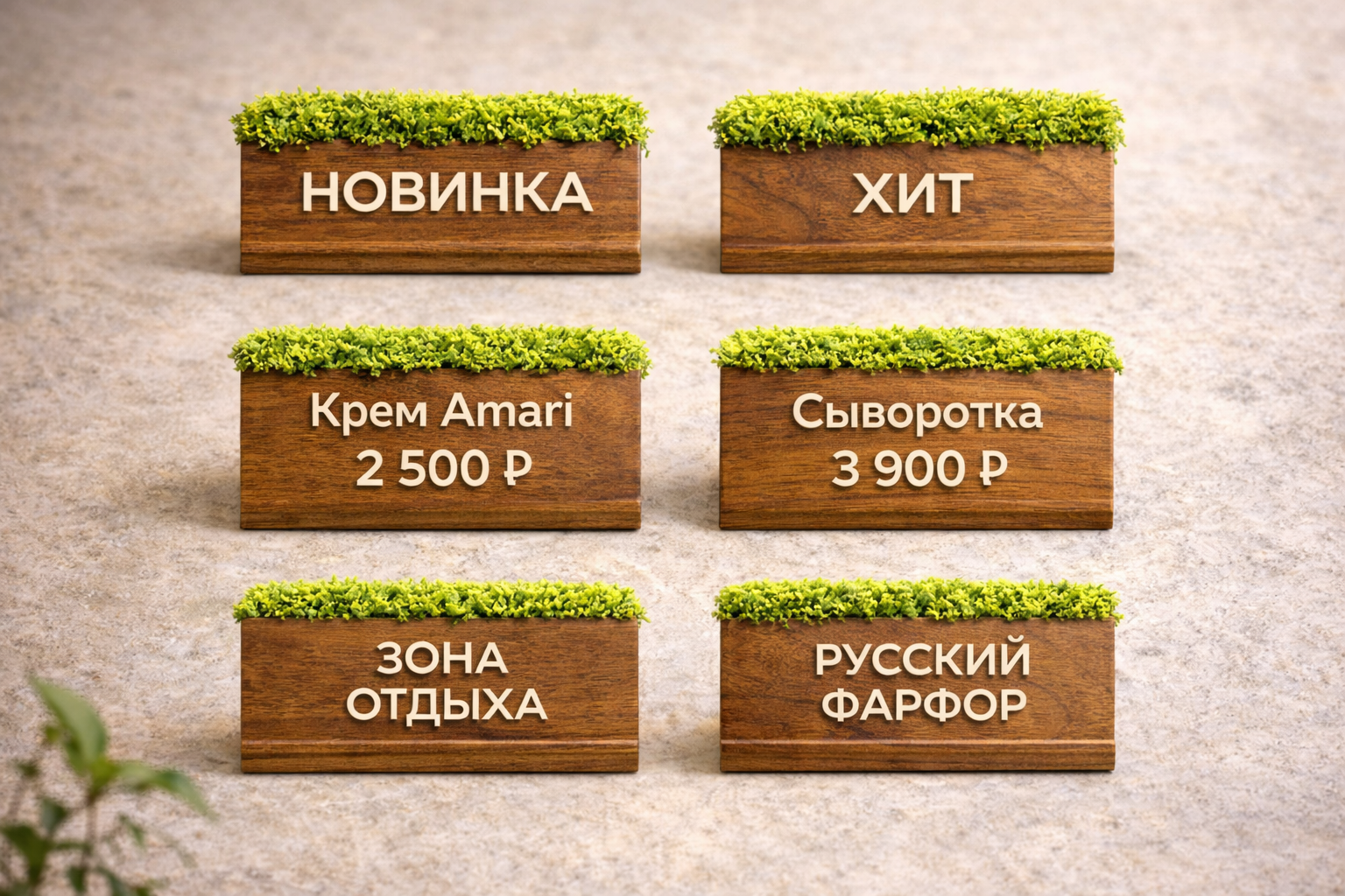 Мох - заметный материал, но его можно сделать спокойным. Бирки выглядят премиально и не «кричат».