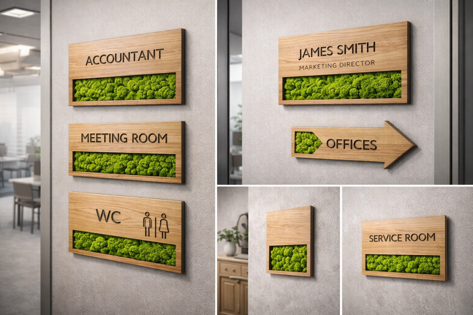 Набор табличек для офиса из дерева с мхом - это готовый стандарт: единые размеры, типографика и логика размещения, которые можно масштабировать на этаж, офис, бизнес-центр или сеть. В MossArt вы заранее видите результат на фотореалистичном макете из реальных материалов - и получаете итог “1 в 1”.