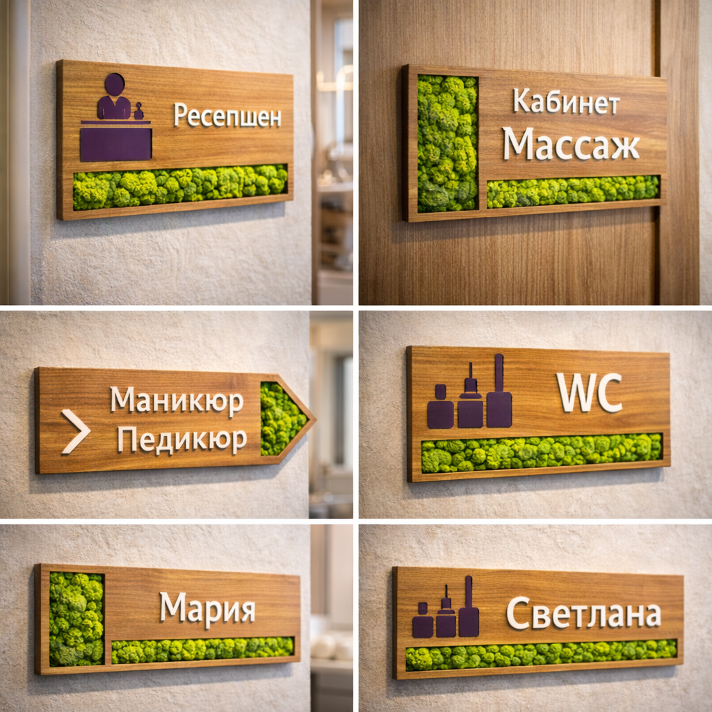 Набор табличек для салона красоты из дерева с мхом - это готовая система: понятная навигация, премиальная подача и единый стиль на всех дверях. В MossArt вы заранее видите фотореалистичный макет из реальных материалов - и получаете итог “1 в 1”.