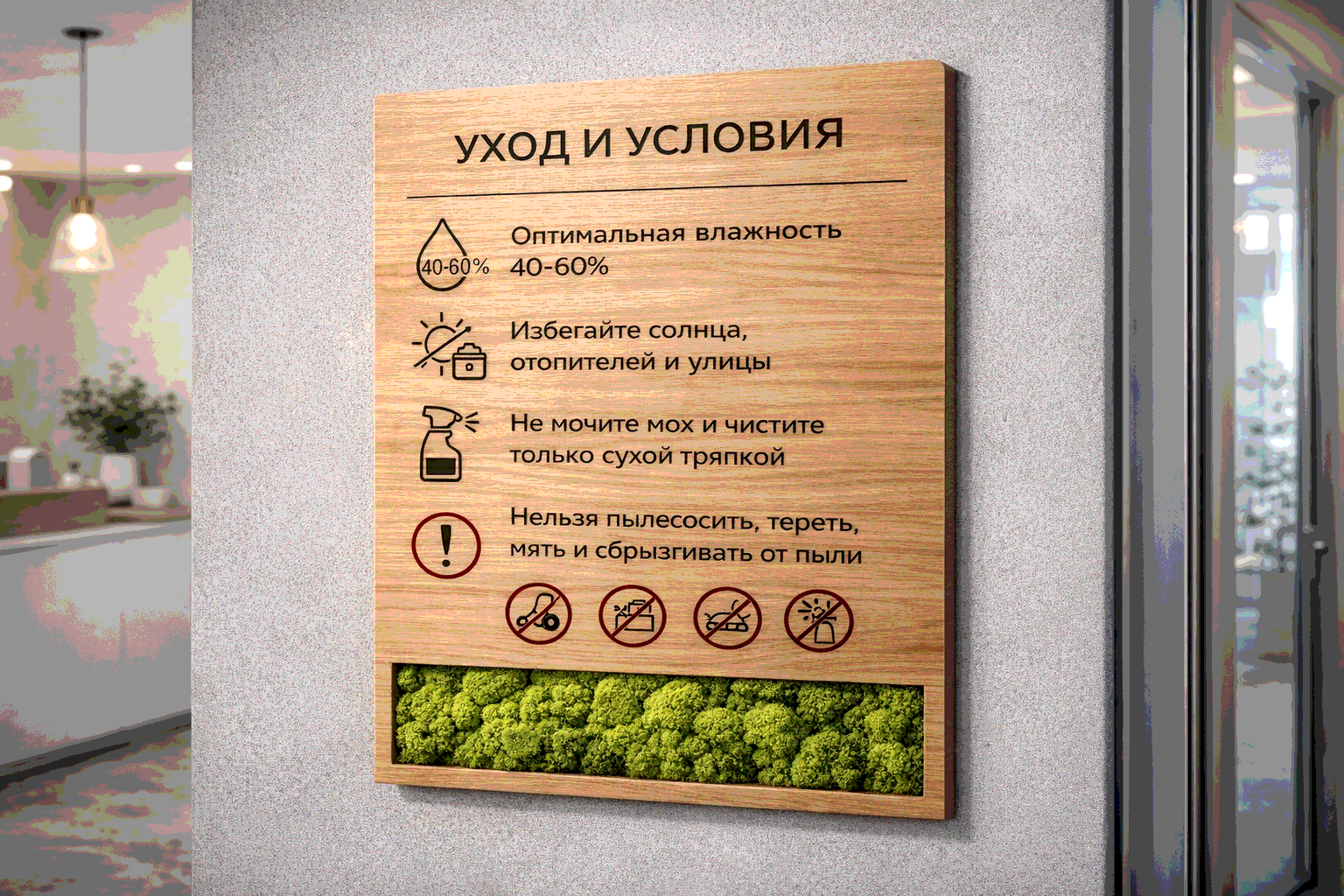 Если воздух слишком сухой (часто зимой при активном отоплении), мох может стать жёстче на ощупь и слегка “сжаться”. Это не поломка - просто реакция натурального материала на пересушенный воздух. В таких случаях помогает нормализация микроклимата (увлажнитель в помещении, корректировка отопления).