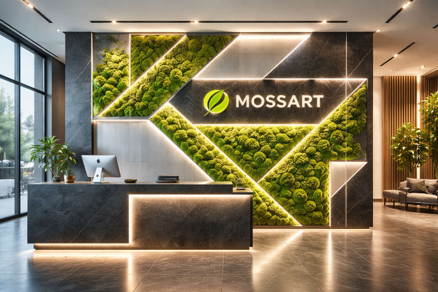 Вы заранее видите, как мох будет смотреться в строгой геометрии, на вашей поверхности и с подсветкой.