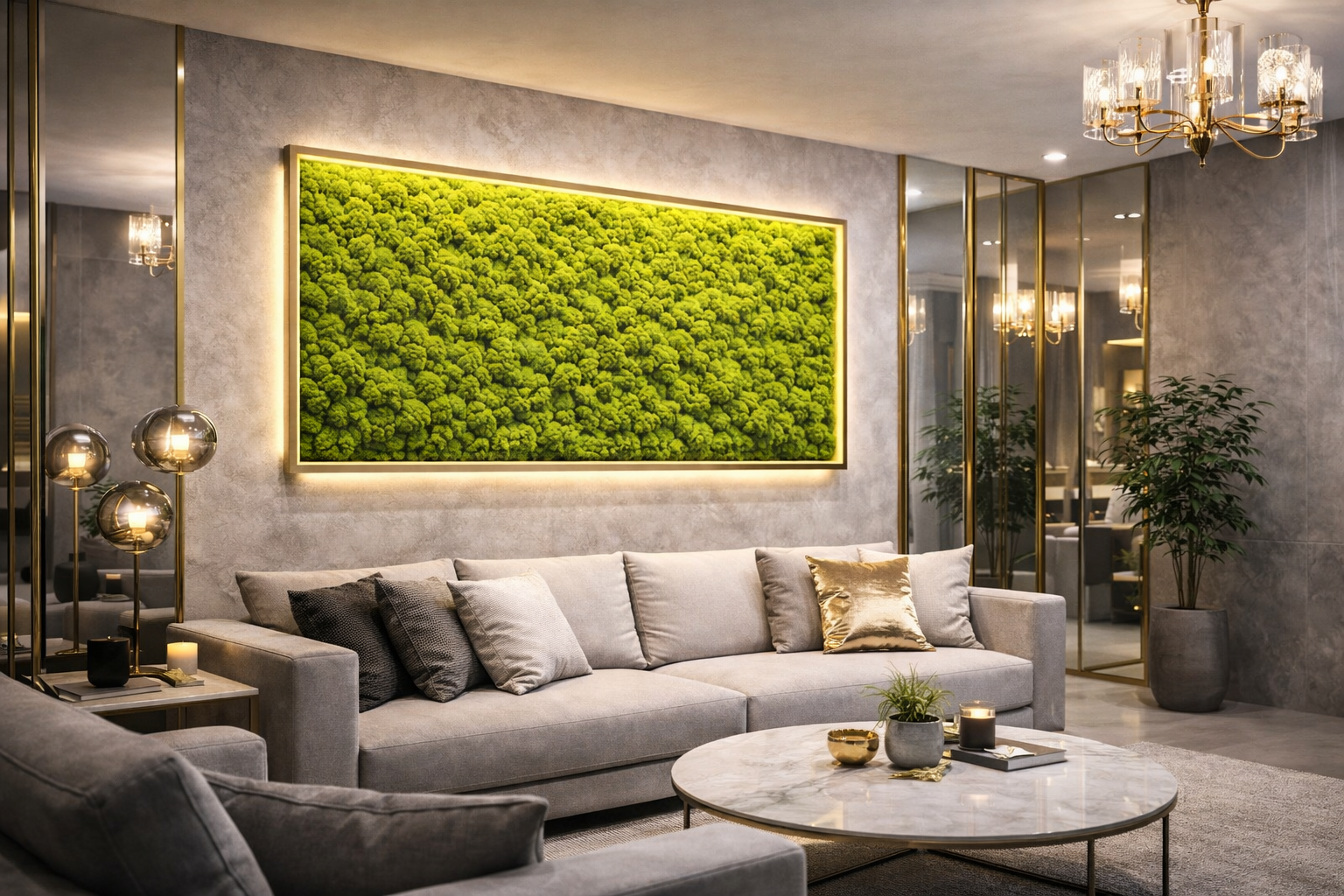 Главное - подача. В modern glam мох должен выглядеть как дизайнерский объект: с рамкой, контуром, встроенной подсветкой и правильным масштабом.