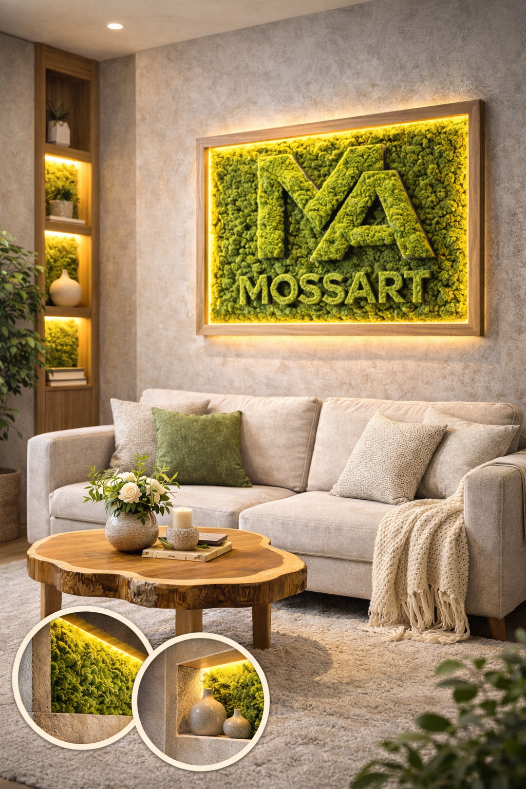 Мох не требует полива и не зависит от света (при корректных условиях размещения). Это важно для органического модерна: интерьер должен оставаться спокойным и предсказуемым, без риска, что зелень “поплывёт” или начнёт выглядеть иначе.