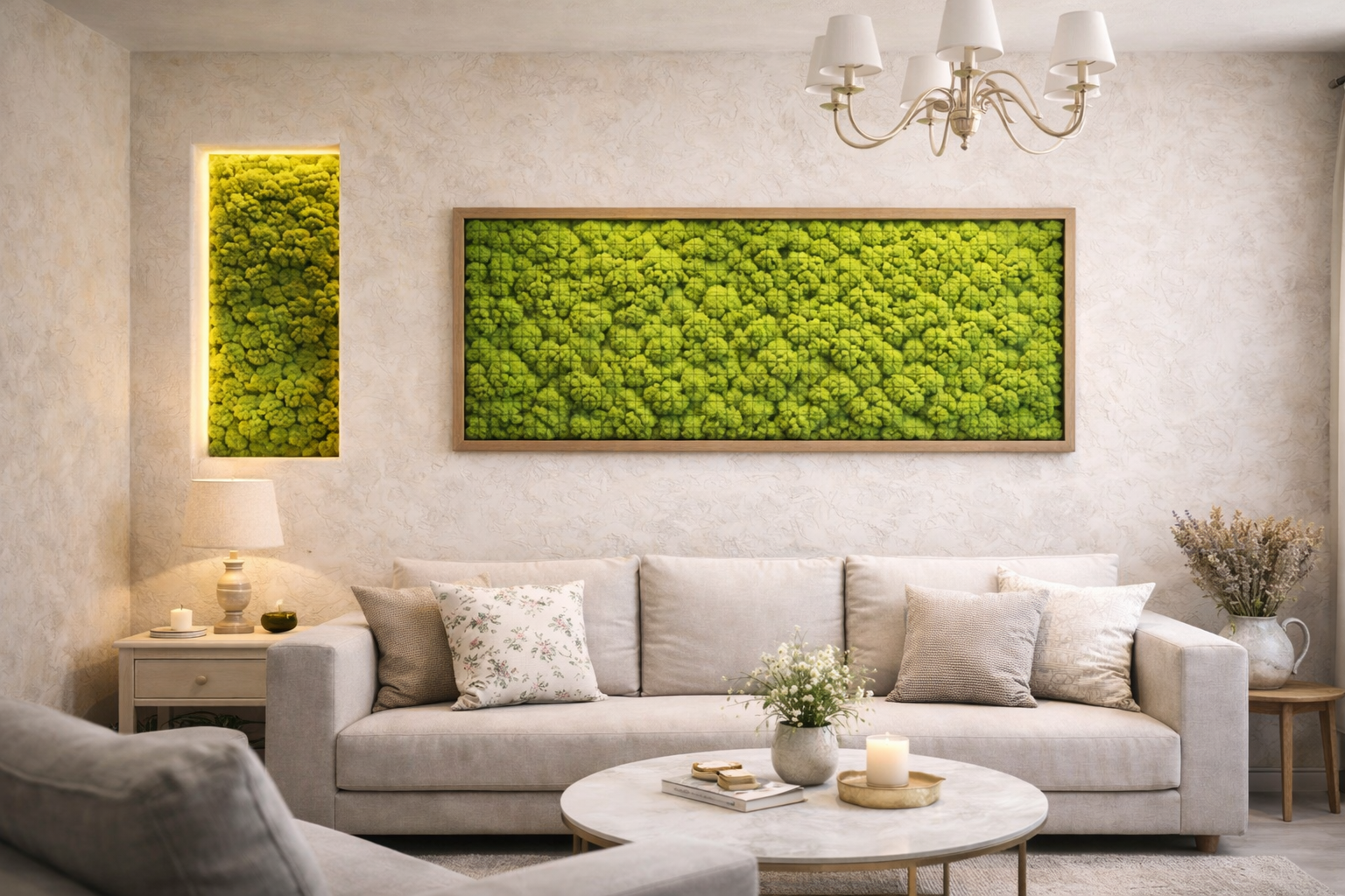 Если мох оформлен как интерьерный объект (рама/дерево/ниша), он выглядит ухоженно и “дорого”.