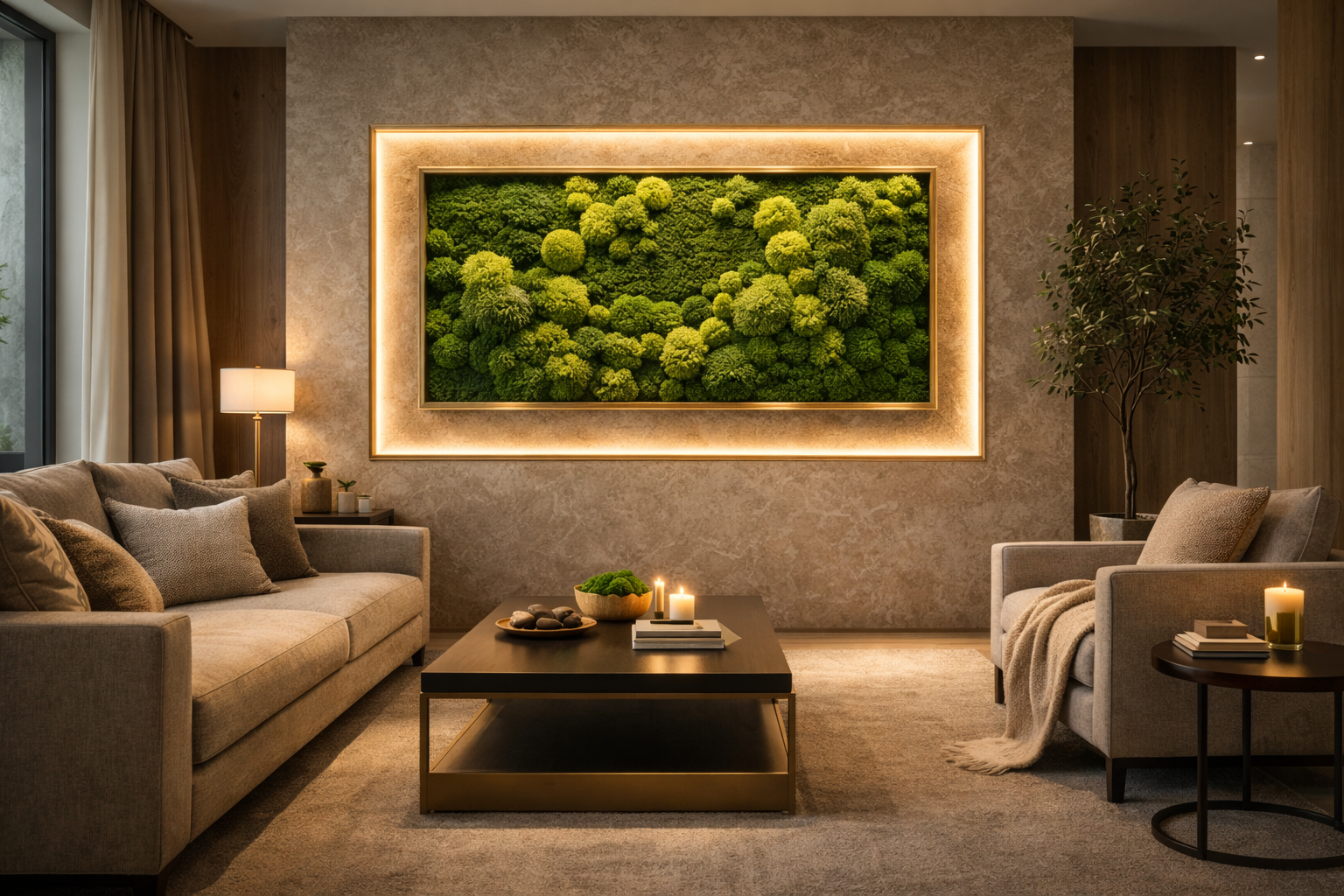 В премиальном интерьере важно, чтобы ничего не “плывало”. Мох даёт стабильную картинку без сервиса.