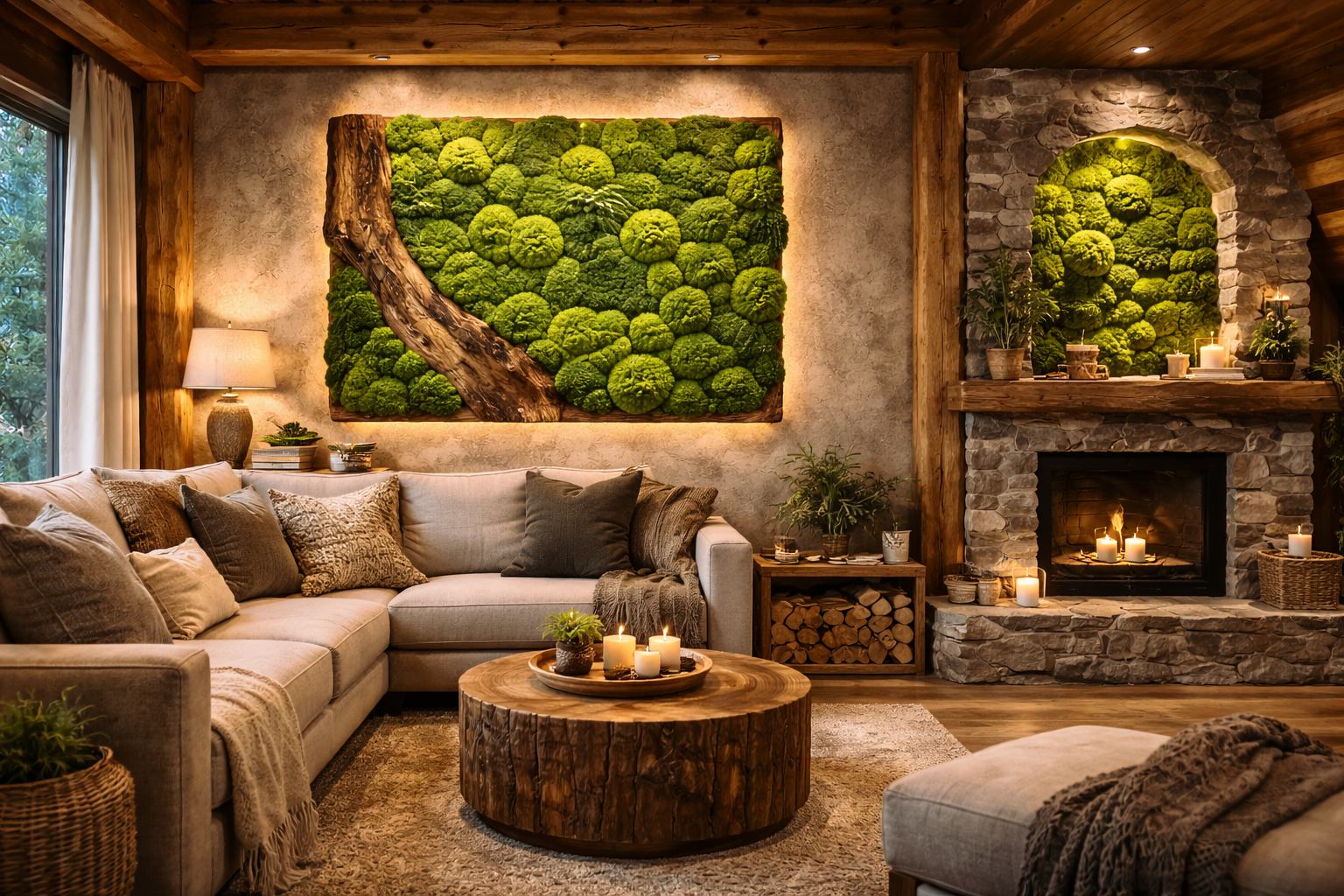 Слэб/панель дерево+мох + мягкий тёплый свет (и безопасная дистанция от тепла).