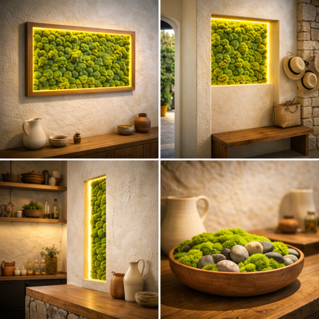 На светлых стенах мох читается как аккуратный природный акцент, не перегружая интерьер.