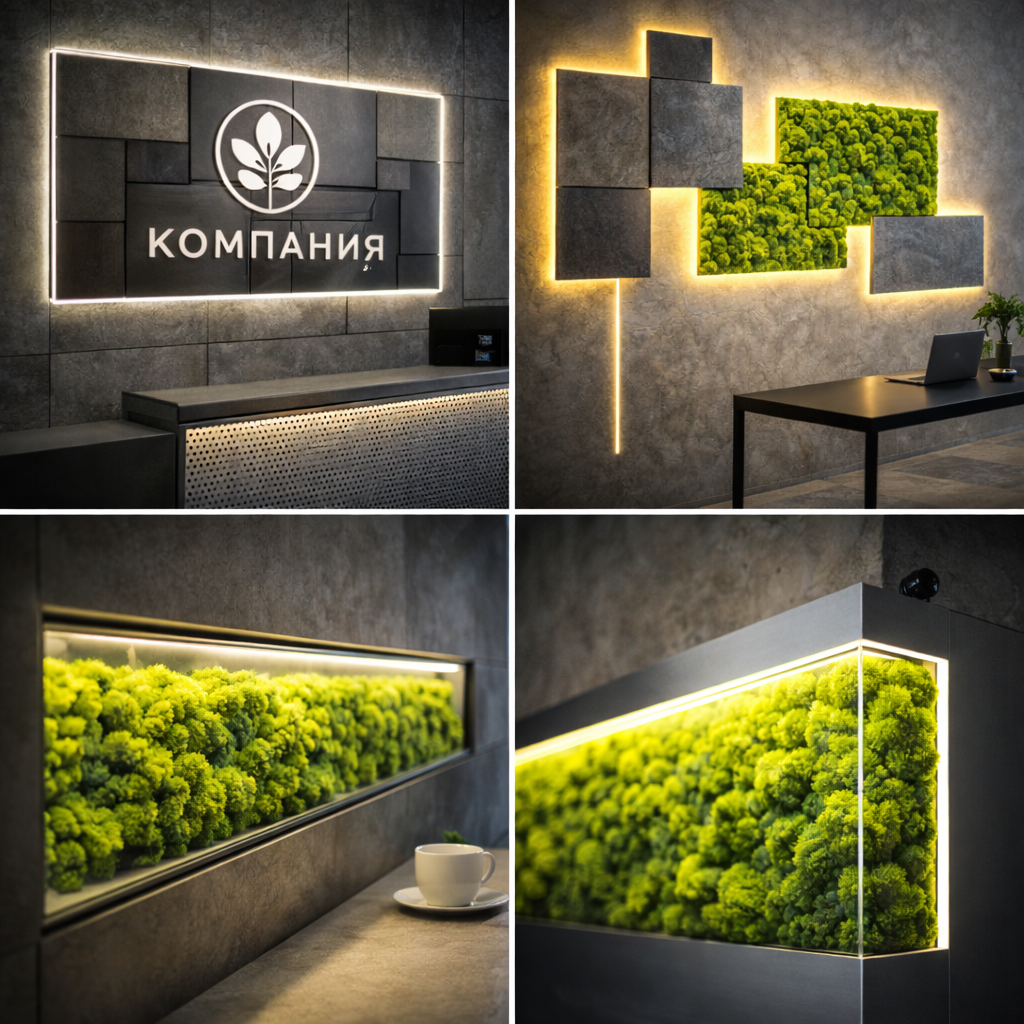 Логотип из мха + контурная подсветка + металл/акрил в основе - читаемо и технологично.