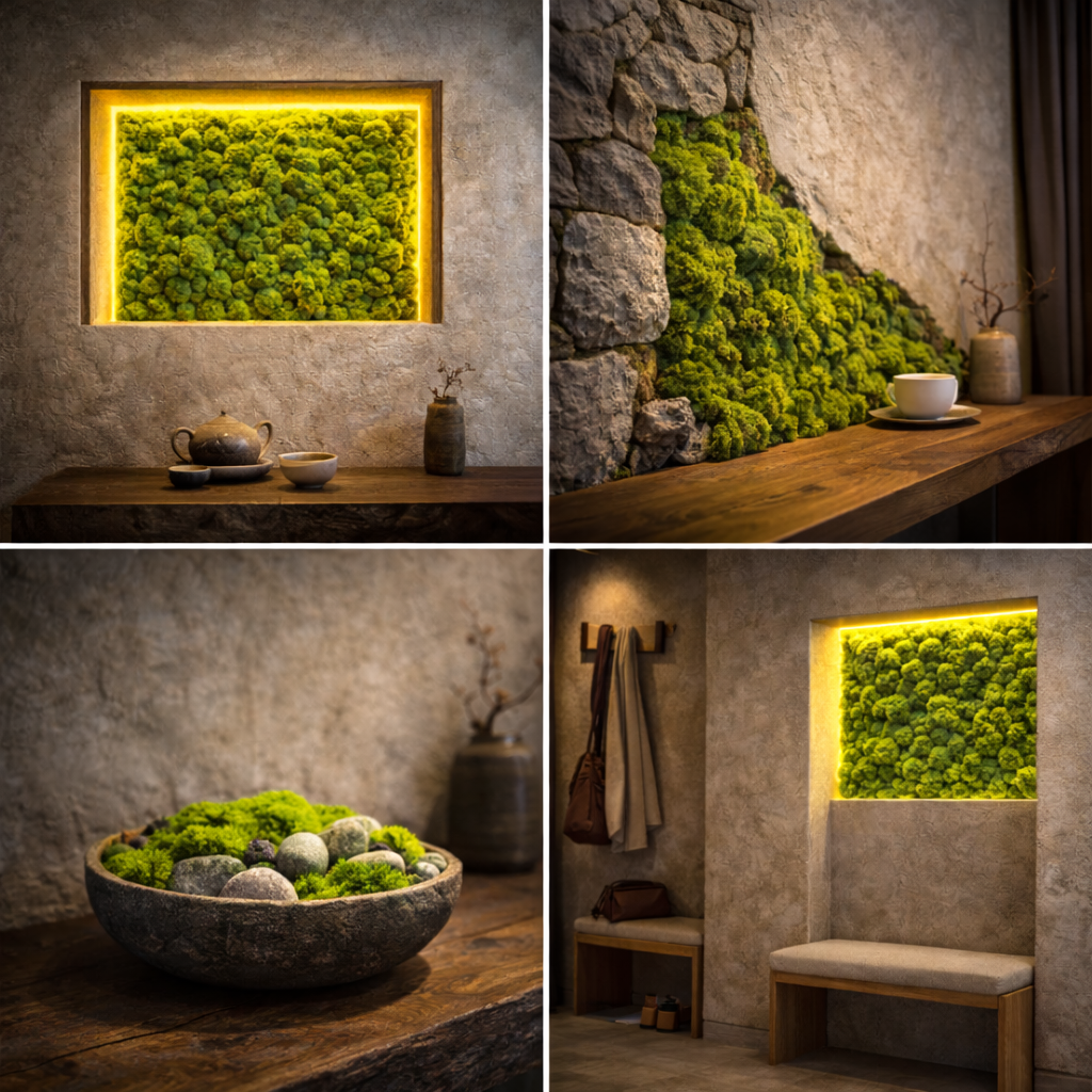 Стабилизированный мох очень органично вписывается в wabi-sabi, если использовать его не как “зелёную картинку”, а как фактуру. Он даёт мягкий объём и природную эмоцию, при этом не требует полива и не зависит от света (при корректных условиях размещения). Значит, интерьер остаётся спокойным и предсказуемым - без хлопот.