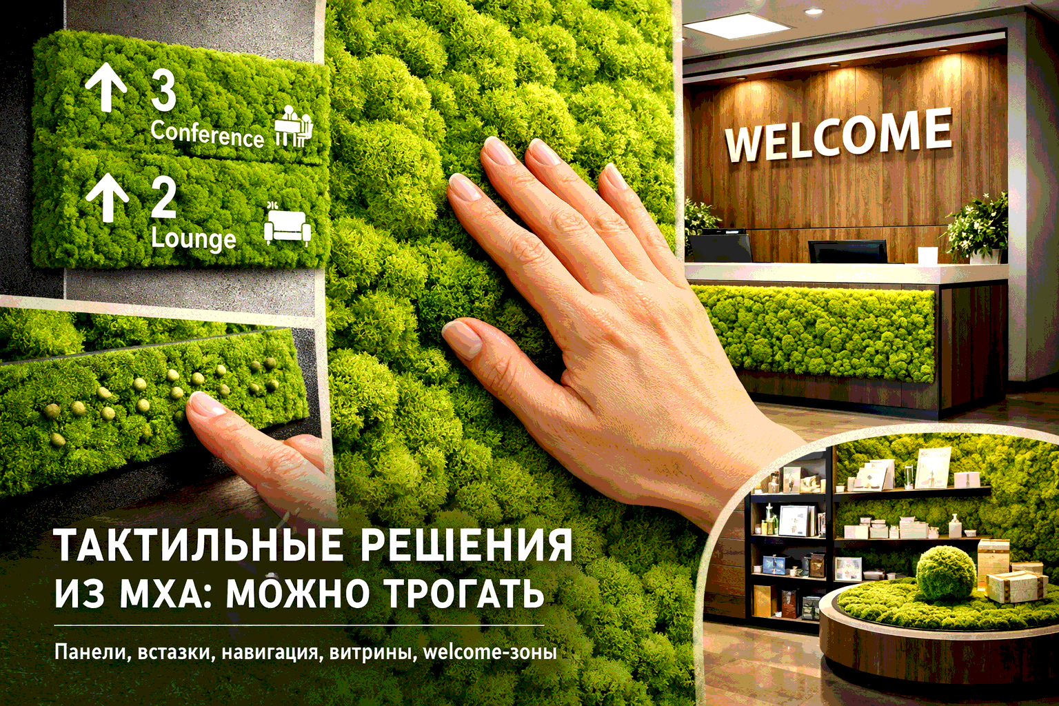 MossArt делает тактильные решения из стабилизированного мха, которые можно трогать: панели, вставки, навигацию, витринные подиумы, welcome-элементы и стенды. Мох мягкий, объёмный и “живой” на вид, но при этом не требует полива и света.