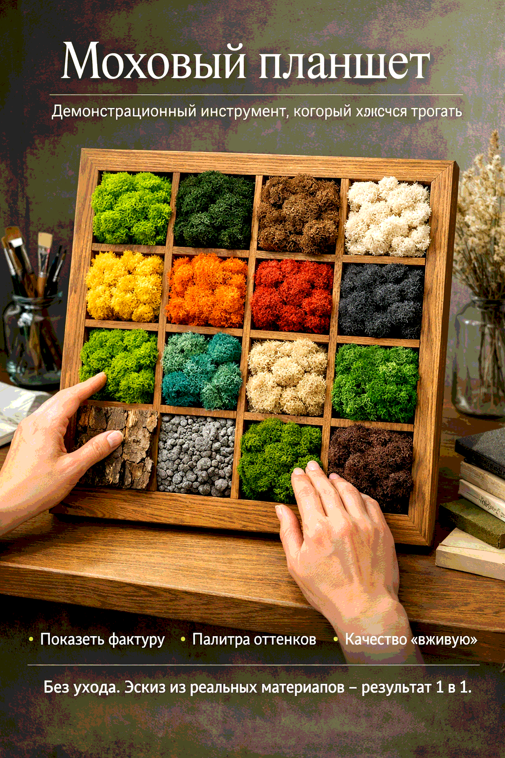Иногда мы делаем планшет сразу под будущий проект: нужный оттенок мха + материал основания, чтобы согласование прошло быстрее.