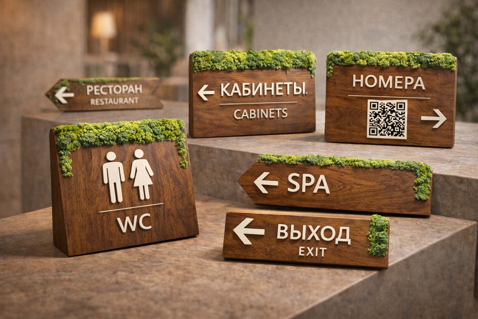 Тактильная навигация с мхом - это таблички и указатели из дерева со стабилизированным мхом, которые считываются легко, выглядят премиально и создают мягкий антистресс-эффект. Их хочется коснуться, рассмотреть ближе, и именно поэтому они работают лучше “плоских” решений.