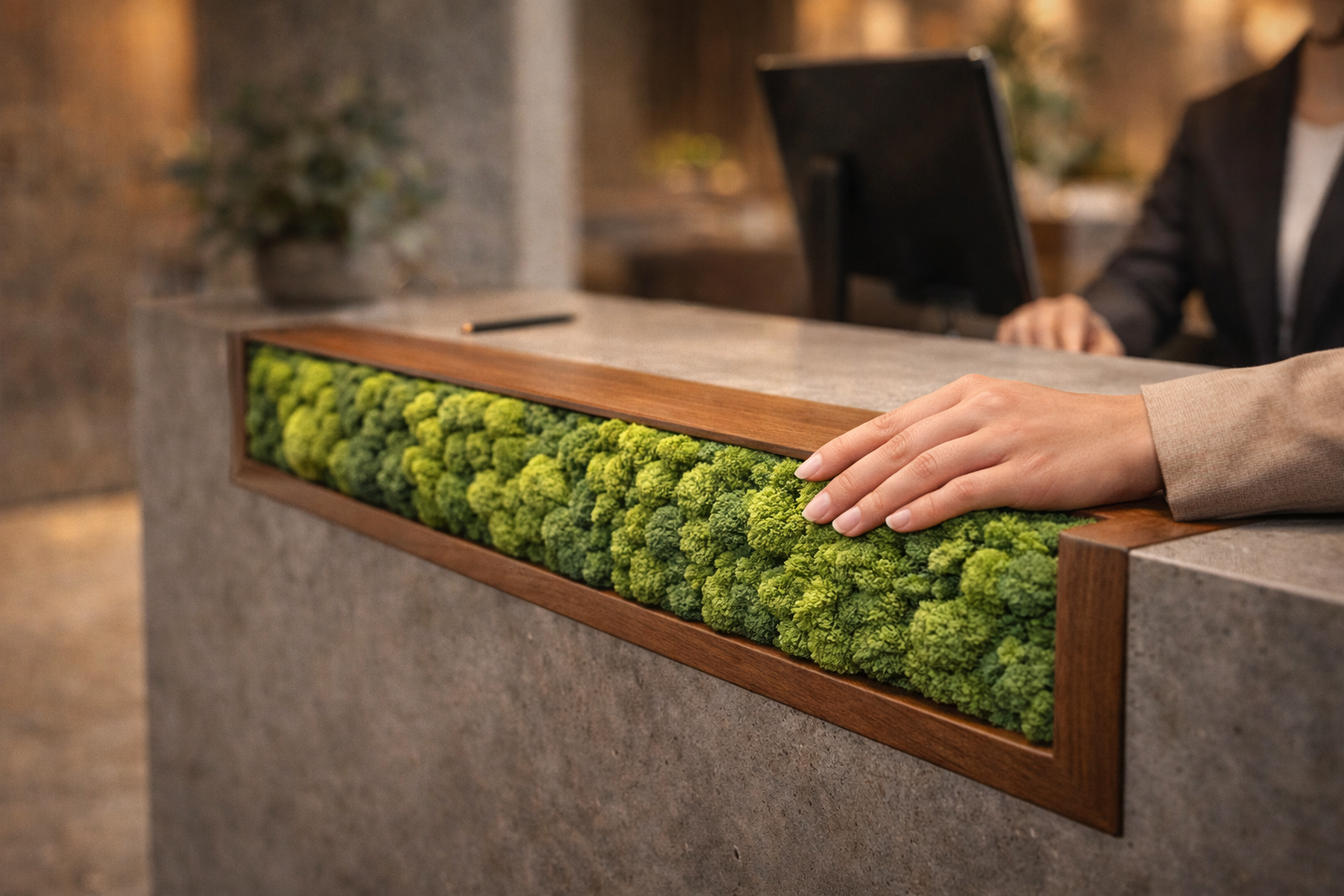 Тактильная моховая вставка - это фрагмент из стабилизированного мха, встроенный в стойку ресепшена (или в её фасад/столешницу/зону контакта). Она добавляет мягкость, глубину и ощущение заботы - без лишнего декора и без ухода.