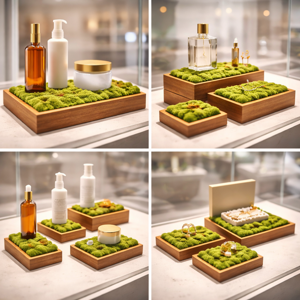 Моховая вставка - тактильный приём, который работает тонко и дорого. Стабилизированный мох добавляет объём и фактуру, а подиум или подставки превращают выкладку в аккуратную «сцену» для продукта - без ухода и без визуального шума.
