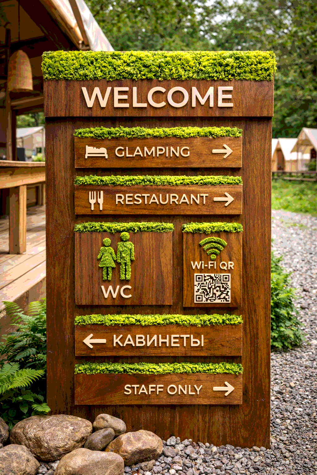 Сильное решение - единый язык на всём объекте: welcome-стенд + номера домиков + указатели + правила + QR.